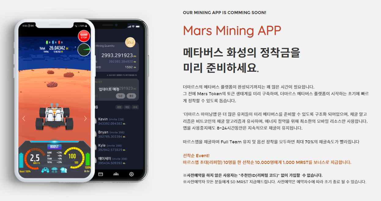 오늘은 더 마르스 프로젝트에 대해서 알려드리도록 하겠습니다. 보통 더 마르스 프로젝트라고 한다면 다들 코인 채굴을 하는데 바쁘실 것입니다. 그렇지만 더 마르스 프로젝트는 생각보다 괜찮은 프로젝트라고 생각합니다. 우선은 더 마르스에 대해서 먼저 말씀드리도록 하겠습니다.