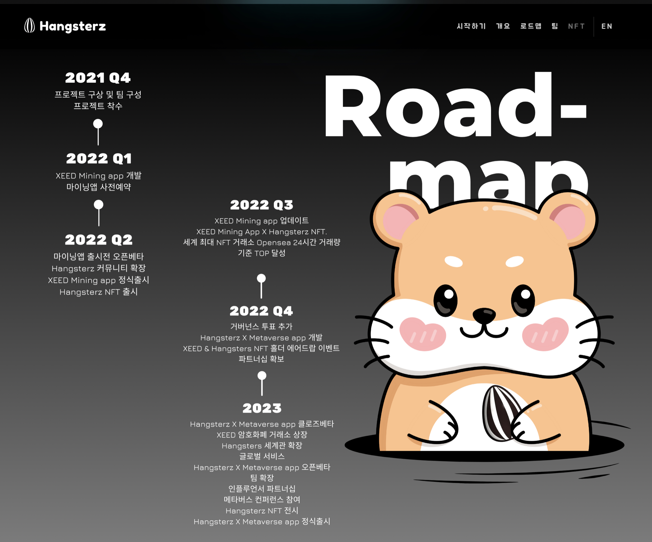 로드맵 상으로 현재 2022년 2분기에 해당합니다. 마이닝 맵이 출시가 되었고, 마이닝 맵을 기반으로 하여 행스터즈 NFT가 나올 것으로 예상됩니다. 요즘 NFT 시장이 전반적으로 비슷합니다. 어플을 출시하고 NFT를 가지고 있으면 마이닝을 훨씬 더 많이 지급한다던지 혹은 여러 가지 소각 시스템을 만들고, 향후 어떻게 될지 모르겠지만 게임이나 메타버스와 접목시켜서 NFT를 잘 쓸 것으로 예상됩니다. 그리고 채굴한 코인을 기반으로 여러 가지 물건이나 소각을 할 수 있는 용도가 반드시 필요하다고 생각합니다. 그리고 2023년에는 다양하게 메타버스 세계관이나 여러 가지 파트너십을 예정하고 있습니다.
