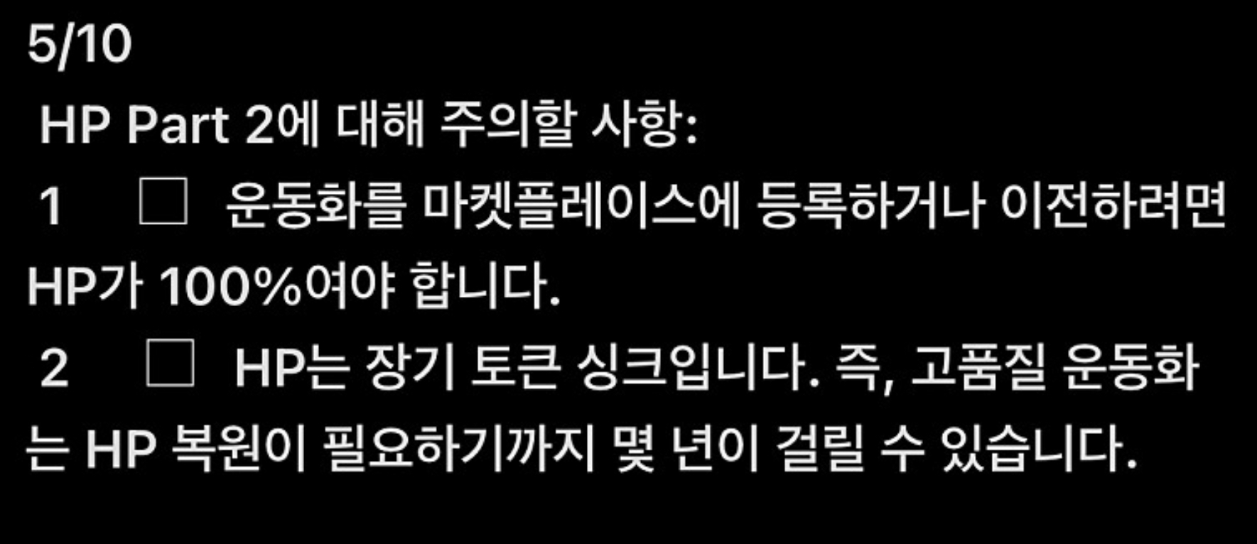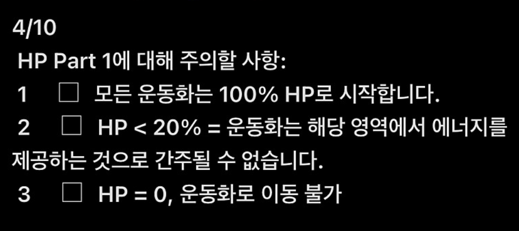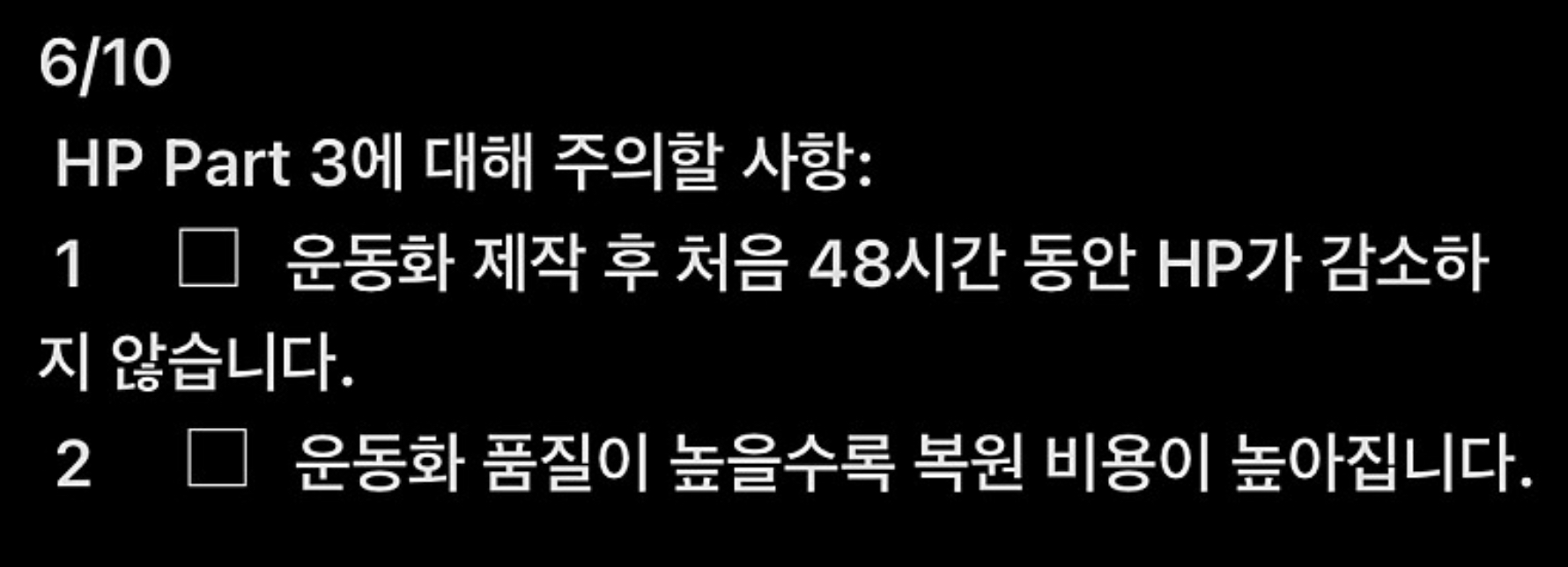 hp에 관련된 내용입니다. 게임하는 것 같네요... ㅋㅋㅋ hp가 20퍼센트 이하일때 저 문구가 사실 잘 해석이 안됩니다. 원본을 봐도 잘 모르겠어요. 운동은 가능한데 에너지를 소모 못한다? 이런 느낌인지 모르겠는데 혹여나 아시는 분 있으면 댓글로 남겨주세요.. 그리고 hp 복원을 위해서 몇 년이 걸릴 수도 있다고 하는데..? 실화입니까 ㅋㅋㅋ 그리고 마지막으로 운동화 제작 후 처음 48시간 동안 hp가 감소하지 않는다고 합니다. 그리고 운동화 품질이 높을수록 복원 비용이 높아진다고 하는데 음.. 아마 등급? 이야기 하는거겠죠. 커먼<언커먼<레어<에픽 이런 느낌? hp와 관련된 내용은 여기까지입니다. 마지막으로 총정리에서 다시 언급하겠습니다.